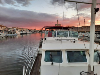 Mercredi 17 mars, 6h00 : Agitation sur le Pilgrim, dans le port d’Aigues-Mortes qui sommeille encore. Il est prévu de partir avec le jour, pour être au Grau du Roi à 7h45, heure d’ouverture du pont tournant qui nous sépare de la mer.